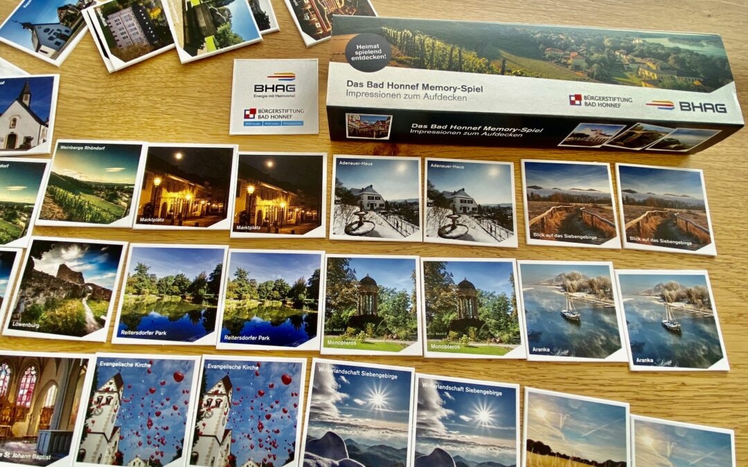 23.10. 2025 Zum ersten Mal gibt es ein Memory-Spiel mit Motiven aus unserer Heimatstadt. Das Spiel ist ein Gemeinschaftsprojekt der Bürgerstiftung und der Bad Honnef AG. Die Idee und die Durchführung kommt von unserem stellvertretenden Vorsitzenden, Jakob Walkembach.