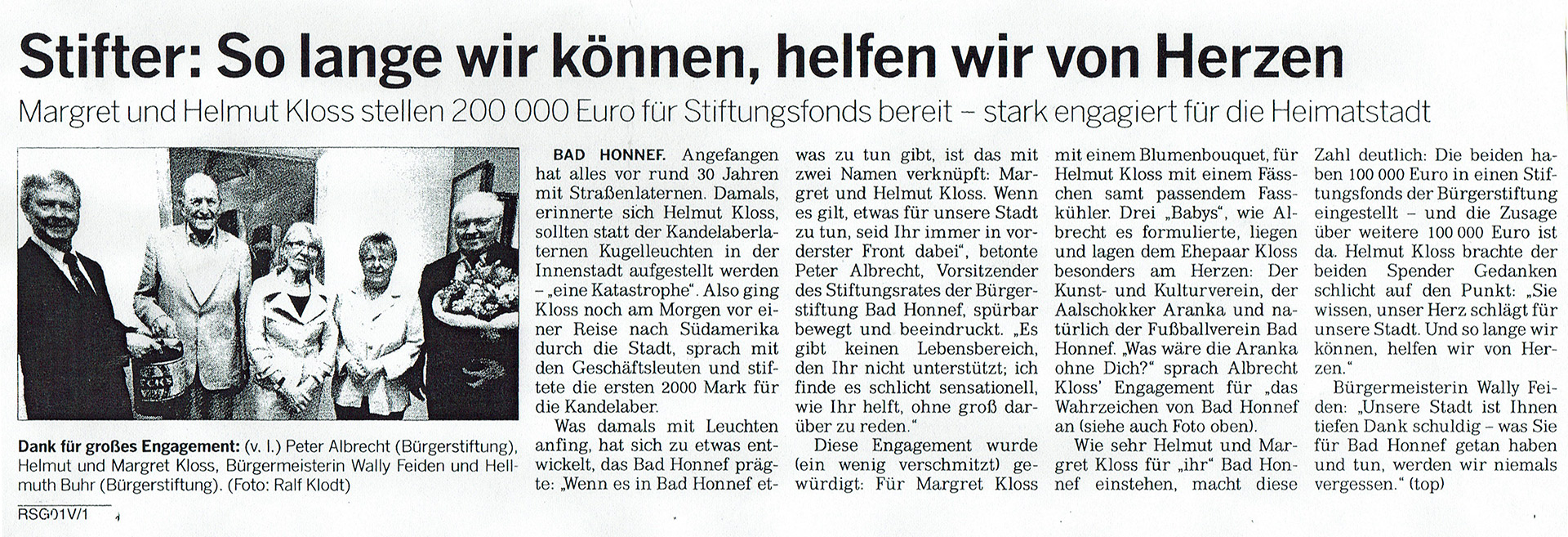 Mit den Erträgen des Helmut Kloss-Stiftungsfonds werden in Bad Honnef dauerhaft Kunst und Kultur, der Sport sowie der Denkmalschutz gefördert. Das Stiftungsvermögen in Höhe von 200.000 Euro bildet dafür eine verlässliche Grundlage.
